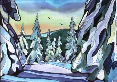 “Снігові смереки”, 2007р., папір, акварель, гуаш, 21×30 см.